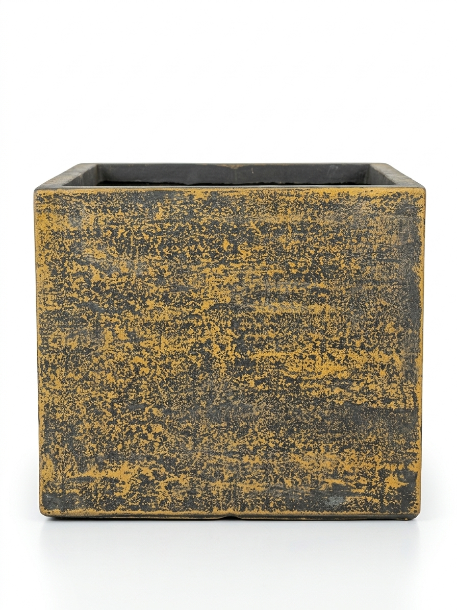 Квадратна кашпа с декоративен черно-златист финиш и текстуриран ефект. Подходяща за модерни и индустриални интериори, както и за външни пространства. Компактната форма я прави идеална за цветя, малки растения или аранжировки. Здрава конструкция и стилен дизайн, който придава акцент на всяка среда.