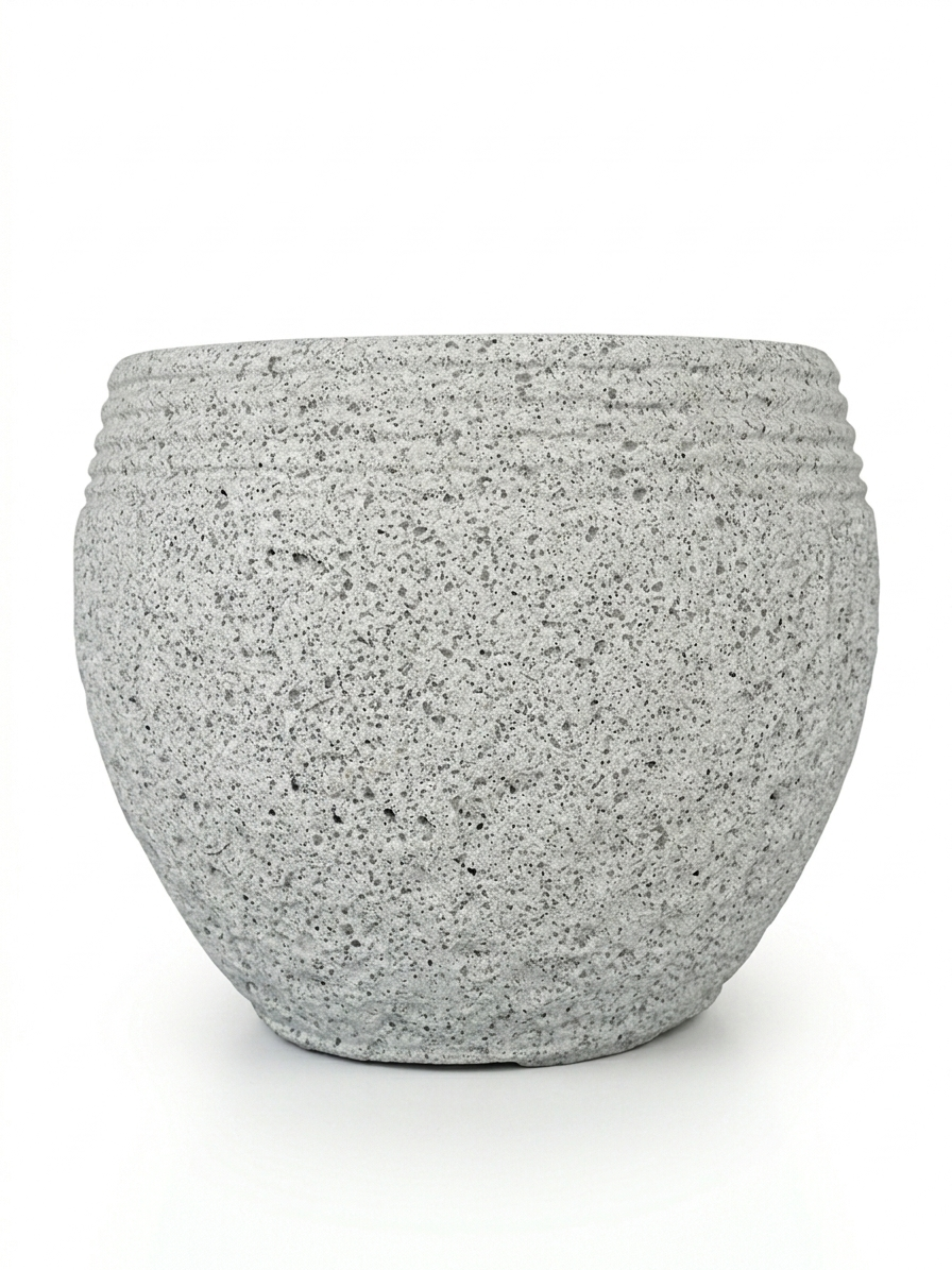 Декоративна кашпа с бетонна визия в сив цвят и текстуриран релеф. Подходяща за външна употреба в градини, дворове и тераси, както и за интериор в модерен или индустриален стил. Здрава и устойчива конструкция, идеална за различни видове растения.